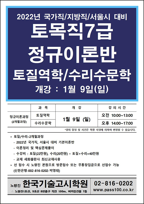Åä¸ñÁ÷ 7±Þ | ÅäÁú¿ªÇÐ, ¼ö¸®¼ö¹®ÇÐ | • 1¿ù 9ÀÏ(ÀÏ), ¿ÀÀü 10:00 | - 2022³â ±¹°¡Á÷, ¼¿ï½Ã ´ëºñ¹Ý. |